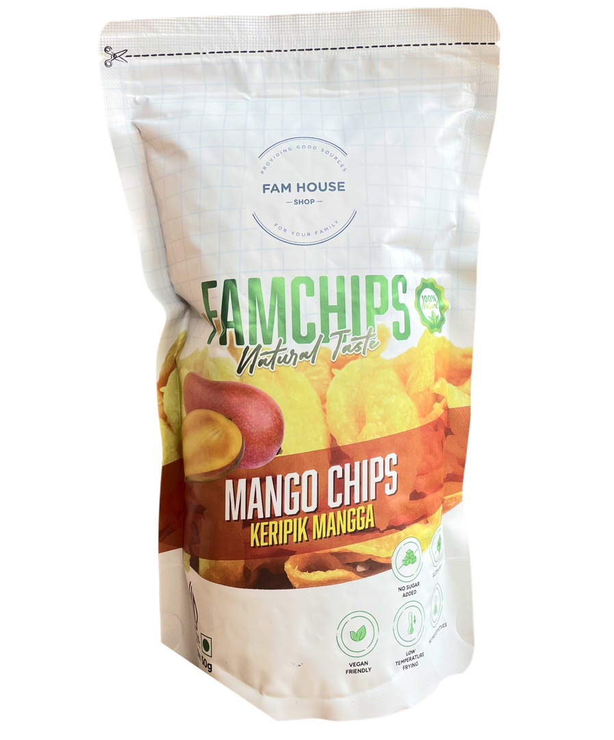 Keripik FamChips itu enak banget! Favoritku Mango Chips—asam manisnya pas dan renyah